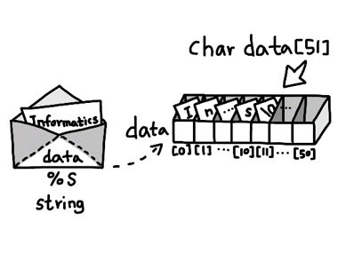 문자를 50개 저장하기 위해서는 char data[51] 로 선언하면 된다.
