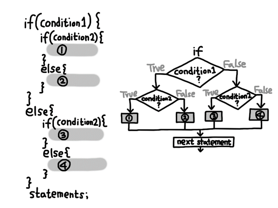 조건/선택 실행 구조의 안에 조건/선택 실행 구조를 다시 "중첩"할 수 있다.