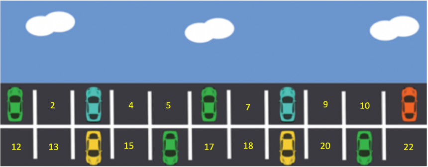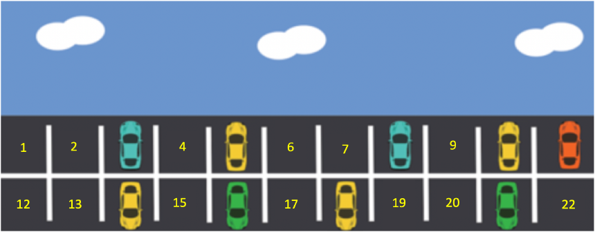 어떤 주차장에 22개의 주차 공간이 있고, 각 주차 공간의 바닥에는 1부터 22까지의 번호가 쓰여있다.