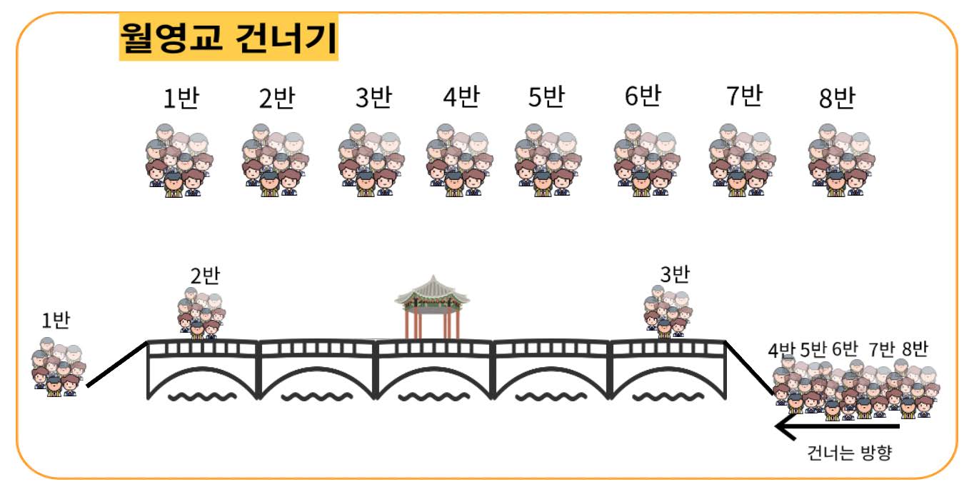수학여행으로 월영교를 찾은 학생들이 학급 순서대로 가능한 한 빨리 다리를 건너가려고 한다. 학교에서는 학생관리와 안전지도를 위해 다리 위에서는 학급 단위로 이동하고, 다리를 건너는 인원을 관리하기로 했다.